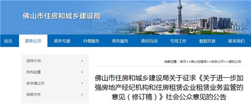 房訊網訊 8月17日,佛山市住房和城鄉建設局發布《關于進一步加強房地產經紀機構和住房租賃企業租賃業務監管的意見(修訂稿)》,向社會公眾征求意見。