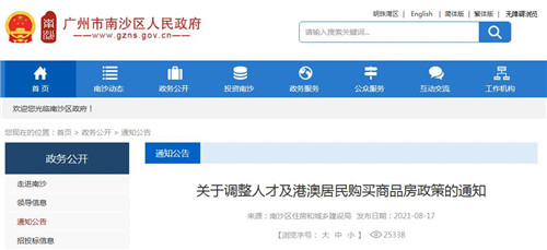 房訊網訊 8月17日,廣州市南沙區住建局等4部門聯合發布《關于調整人才及港澳居民購買商品房政策的通知》,提出廣州南沙人才卡A卡、B卡的持卡人才,可在符合廣州市商品住房限購總套數規定的前提下在南沙區范圍內購買住房,規定為戶籍家庭2套、單身1套;非戶籍家庭和單身1套,且能提供購房之日前1年在南沙區連續繳納個人所得稅繳納證明或社會保險繳納證明,不得補繳。