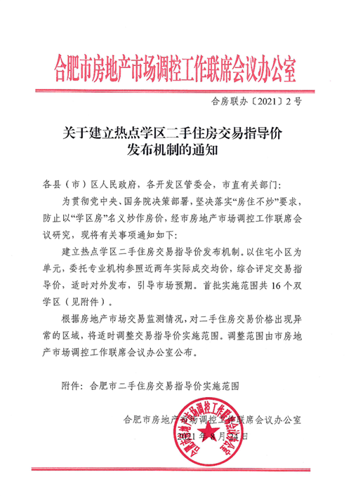 房訊網訊 8月24日,合肥市住房保障和房產管理局發布《關于建立熱點學區二手住房交易指導價發布機制的通知》,提出建立熱點學區二手住房交易指導價發布機制。以住宅小區為單位,委托專業機構參照近兩年實際成交均價,綜合評定交易指導價,實施對外發布,引導市場預期。