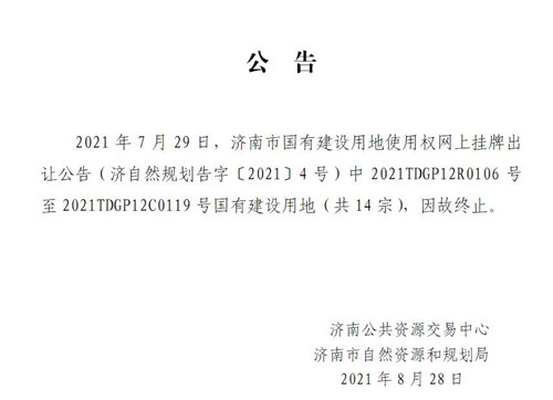 房訊網訊 8月28日,濟南市公共資源交易中心發(fā)布公告,第二批次集中供地中的歷城區(qū)唐冶衡寬、工業(yè)北大辛莊兩個組團共計14宗地塊因故終止出讓。終止的14宗地塊中,含住宅地塊8宗,商業(yè)地塊6宗。總出讓面積417539平方米,約626.3畝。