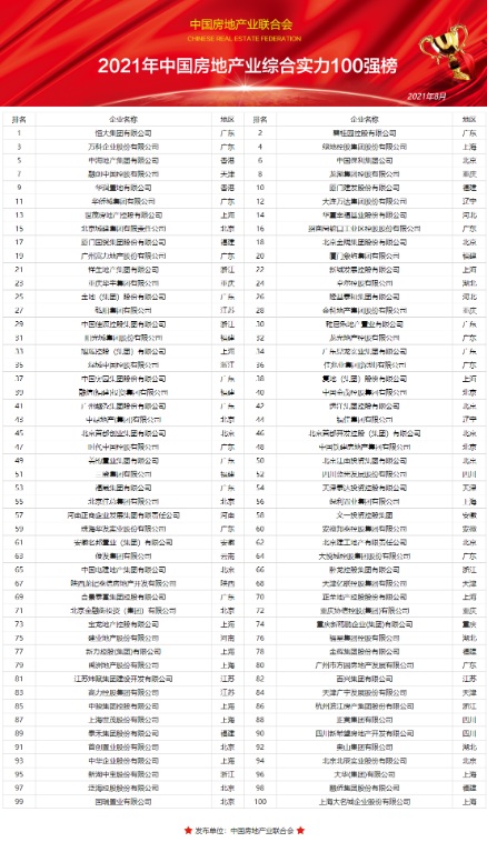 近日,2021年中國房地產(chǎn)業(yè)綜合實力100強排行榜發(fā)布,這是中國房地產(chǎn)業(yè)聯(lián)合會對房地產(chǎn)行業(yè)進行全面、科學、獨立的企業(yè)實力發(fā)展調(diào)查研究宣傳發(fā)布工作。通過對全國34個省(區(qū)、市)超過3000家利潤總額在1億元至800億元之間的中國房地產(chǎn)開發(fā)企業(yè)進行了數(shù)據(jù)采集研究,比照國際上通行的做法,主要根據(jù)營業(yè)收入、資產(chǎn)總額、利潤總額、資信等級、社會貢獻、業(yè)主滿意度等指標分析確定候選企業(yè),邀請100位企業(yè)高管、學者及官員對經(jīng)資格審核符合要求的企業(yè)進行綜合評分,并對部分候選企業(yè)進行實地拜訪,從中遴選出100家中國房地產(chǎn)業(yè)綜合實力100強企業(yè)。在此基礎(chǔ)上通過與世界500強企業(yè)進行綜合對比分析,進而有針對性地提出促進中國房企做強做大做久的策略建議,在全國范圍內(nèi)形成了巨大的社會影響力。