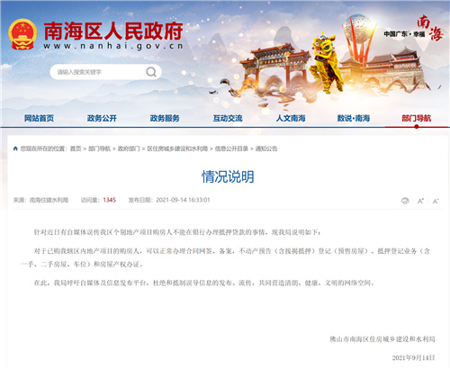 房訊網訊 9月14日,佛山市南海區住房城鄉建設和水利局針對近日有自媒體誤傳該區個別地產項目購房人不能在銀行辦理抵押貸款的事情,發布了情況說明。