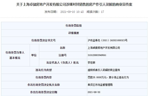 上海奉賢市場監督管理局網站近日公布的行政處罰決定書《關于上海卓骕房地產開發有限公司涉嫌對其銷售的房產作引人誤解的商業宣傳案》(滬市監奉處〔2021〕262021000323號)顯示,上海卓骕房地產開發有限公司存在虛假或者引人誤解的商業宣傳的違法行為,奉賢區市場監督管理局對其罰款25萬元,責令其停止違法行為。