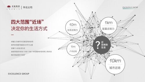 在卓越看來,“他附近的場所,決定了他的生活體驗”,城市為無數空間的綜合,可能為500平方公里,但每個人的生活方式,由他所在的10km、1km、10m、1m范圍內的空間和人物決定,這也就是近場力存在的價值和意義。卓越近場力將核心生活場景劃分為10km城市近場力、100m歸家近場力、10m社區近場力、1m戶內近場力,分別從業主的社會關系、生活關系、交際關系和親密關系角度出發,達到工作、家庭、社交和自我的平衡。
