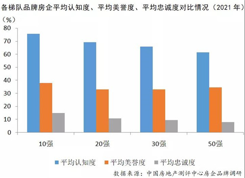 中國房地產(chǎn)測評中心連續(xù)兩年通過消費者調(diào)研,從認知度、美譽度和忠誠度三個維度分析房企的品牌特征。總體來看,2021年,50強品牌房企的認知度、美譽度和忠誠度均出現(xiàn)不同程度的下降。其中,平均認知度為43.49%,較上年下降2.12個百分點;平均美譽度為34.50%,較上年下降3.36個百分點;平均忠誠度為7.93%,較上年下降17.23個百分點。從分化程度看,品牌美譽度的分化程度較大,方差為2.34%;認知度和忠誠度的數(shù)據(jù)相對集中,方差分別為1.24%,和0.30%。