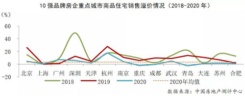 數(shù)據(jù)顯示,10強品牌房企近三年在重點城市銷售溢價率多分布于0-15%區(qū)間范圍內(nèi),其中2020年的平均數(shù)據(jù)為3.24%,均值比上年下降6.79個百分點。近年來,在“房住不炒”的政策背景下,房企受到限價政策的約束,品牌房企銷售溢價率整體有所降低。同時,2020年受新冠疫情的影響,品牌房企促銷力度加強,部分房企樓盤銷售均價弱于上年同期。