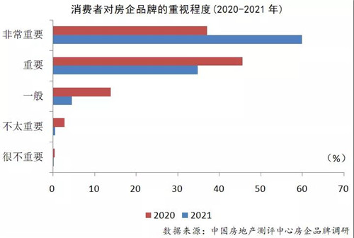 “2021房企品牌調(diào)研問卷”數(shù)據(jù)顯示,對消費者而言,品牌在消費者購房行為中起著重大的影響。2021年,在消費者對房企品牌重視程度方面,選擇非常重要的達59.84%,而2020年僅37.10%。選擇重要的占比34.78%,選擇一般的占比4.57%,不太重要的占比0.59%,很不重要的占比為0.23%,這幾項均小于2020年的占比。總體看來,認為房企品牌重要的人群占比上升,消費群體對企業(yè)品牌建設(shè)重視度有較大提高。