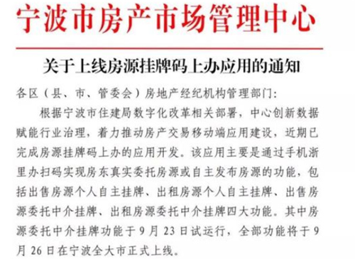 9月23日,寧波市房產市場管理中心發布《關于上線房源掛牌碼上辦應用的通知》,房源掛牌碼上辦主要是通過手機浙里辦掃碼實現房東真實委托房源或自主發布房源的功能,包括出售房源個人自主掛牌、出租房源個人自主掛牌、出售房源委托中介掛牌、出租房源委托中介掛牌四大功能。其中房源委托中介掛牌功能于9月23日試運行,全部功能將于9月26日在寧波全市正式上線。