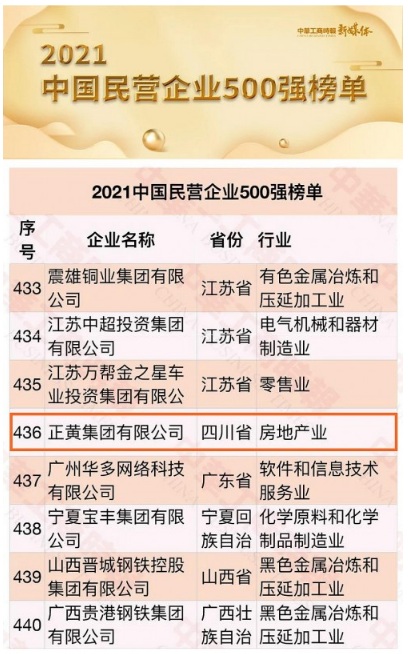 9月25日,由全國工商聯、湖南省人民政府主辦的2021中國民營企業500強峰會在湖南長沙隆重召開。此次峰會上,全國工商聯發布了《2021中國民營企業500強榜單及相關調研分析報告》,正黃集團憑借極具競爭力的發展前景、穩健的經營模式、持續提升的盈利能力再度入榜,位列436位,而在本年度的中國民營企業500強中,四川省共有8家民營企業入榜。