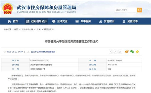 9月22日,武漢市房管局官網公開《市房管局關于加強購房資格管理工作的通知》,通過規范購房資格申請、認定和使用程序,推行購房資格申請全程網上辦,加強對購房資格使用情況的監管,加大對違法違規行為的查處力度,進一步落實國家房地產調控決策部署和武漢市住房限購政策。