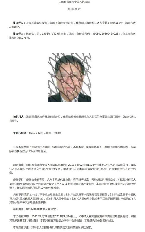 8月31日,青島市中級人民法院就上海三盛宏業投資(集團)有限責任公司、實際控制人陳建銘發布懸賞通告。