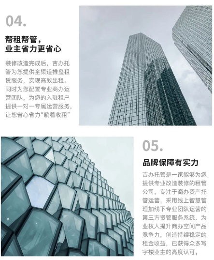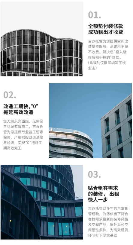 吉辦托管深耕商辦行業多年,擁有寫字樓從前期租前管理、項目升級改造、租賃管理與后期運營管理的豐富經驗,同時在項目升級改造環節擁有一套成熟完善的管理體系,能夠為寫字樓業主提供在商辦領域優質裝修設計等團隊,及施工品質好,性價比高的供應商等參考方案。既能幫助業主完成商辦空間裝修改造,又能實現快速出租,以及提供后期的托管運營服務。