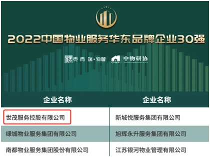 【世茂服務榮登“2022中國物業服務華東品牌企業30強”】