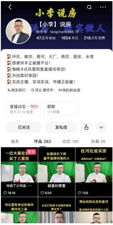一次,一位衡水的客戶為方便通勤打算在京郊買房,結合客戶預算和實際需求,小李為其匹配了北三縣香河的一套房源。由于樓盤搶手,很多樓層未開盤前就已被預定,該客戶看中的樓層也不例外。而小李則憑借自身在快手平臺的影響力,幫助客戶爭取到了心儀房源,“開放商最后把那稀缺房源給到了我,客戶內心也認證我們團隊非常靠譜,很有實力。”