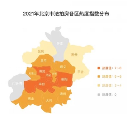 2021年,北京法拍房市場熱度最高的區(qū)域分布在主城區(qū),朝陽、海淀、西城、豐臺熱度頗高,熱度值在7-8之間,門頭溝、懷柔等地熱度最低。