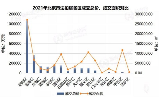 2021年,朝陽區(qū)法拍房以107.66億元絕對優(yōu)勢,遙遙領先其他各區(qū),占據(jù)了成交總額的半壁江山;海淀區(qū)以36.80億元成交總額位居第二。成交面積方面,朝陽區(qū)成交量高達27.15萬㎡,成交面積遠超其他各區(qū)。平谷區(qū)成交新城北部產(chǎn)業(yè)大面積國有建設用地,為成交面積貢獻力量,位列第二位。