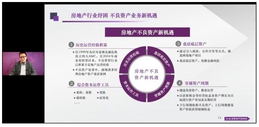北京大成(上海)律師事務所高級合伙人吳晨堯從法律專業的角度分享了不良資產話題:“經濟下行,困境地產項目呈現放量狀態,為投資者絕佳入場機會。困境資產處置核心為價值修復。創新處置方式,包括早期診斷及介入,精準評估資產靜態及動態價值,通過并購重組、精細運營激活資產,有利于深度修復資產價值,獲得超額回報。”