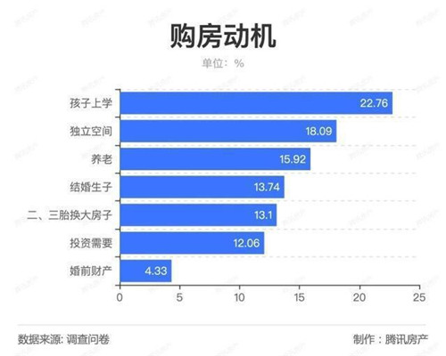 買房動機方面,22.76%的受訪對象買房主要是為了孩子上學,在所有買房動機中位居第一。具體來看,00后要獨立空間,90后為結婚生子,80后為子女上學,70后、60后則為考慮自身養老買房。