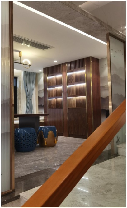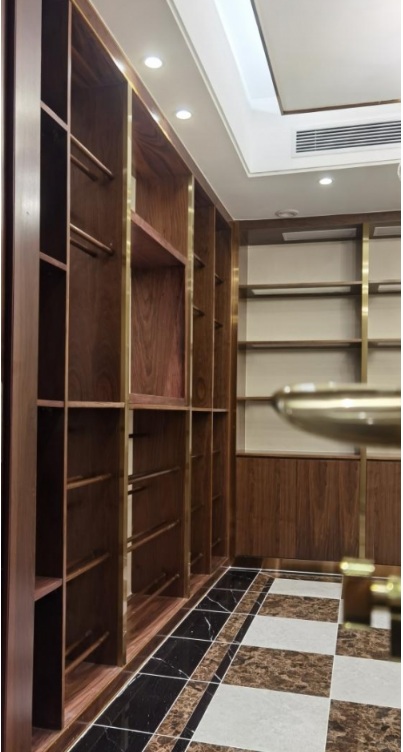 酒窖是設計中的明珠,不僅是因為對搭配的考究,更是要考慮到酒窖位置、溫度濕度、燈光、酒架及其配飾等元素,才能既使整體設計與新中式相融合,又保證了貯藏環境符合標準,因此是非常考驗設計師的設計功力和知識水平。酒窖采用了橡木色的木質酒柜,同時搭配金色金屬邊框,在傳統的中式酒架中增加了現代輕奢的元素,整體視覺效果更顯高檔。