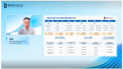 會上,騰訊云智慧建筑與不動產行業解決方案中心總經理沈利重磅發布了最新的智慧建筑與不動產行業解決方案全景圖,其包括面向建筑建造行業的“WeBuild建筑云”、面向地產物業行業的“Wecliet微客來”、面向城市與片區更新行業的“WeSpace智慧空間”等三大解決方案,完整覆蓋 “規劃-設計-建設-管理-交易-運營”六大產業鏈環節,為行業全面數字化轉型提供助力。
