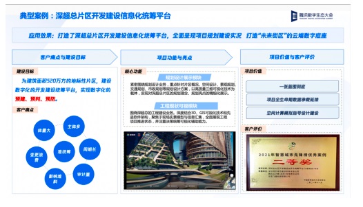 為了支撐“深超總”片區項目這一國際地標級建設項目的開發,實現數字化的預建、預判、預防,深灣發展通過引入騰訊WeBuild建筑云,完成了深超總片區開發建設信息化統籌平臺的構建。基于WeBuild提供的數字孿生能力,該平臺打造了規劃設計展示、工程現狀可視化兩個核心模塊,為深超總項目的規劃和建設業務提供了重要支撐。據介紹,該統籌平臺項目也榮獲了2021年中國智慧城市先鋒榜優秀案例的二等獎。
