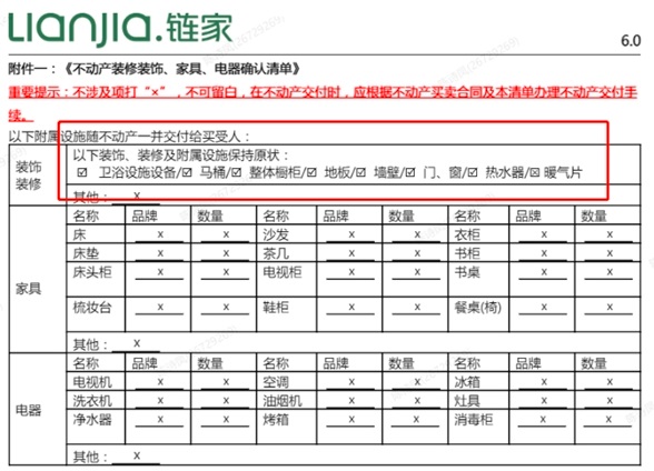 由于買賣雙方簽訂合同時已至深夜,王女士記不了太多東西,故只在合同中勾選部分裝飾、裝修和附屬設施約定交房時會保持原狀,未配合填寫任何家居、電器情況,并預留1000元物業交割保證金。