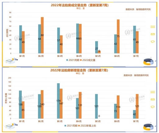在北京法拍房成交數據中,2022年北京法拍房成交量走勢基本與去年同期持平,在第2周成交80套法拍房,創下新高。在即將上拍的北京法拍房中,第6周和第7周,出現了明顯的掛牌量上漲,第7周的掛牌量甚至達到去年同期的3倍。