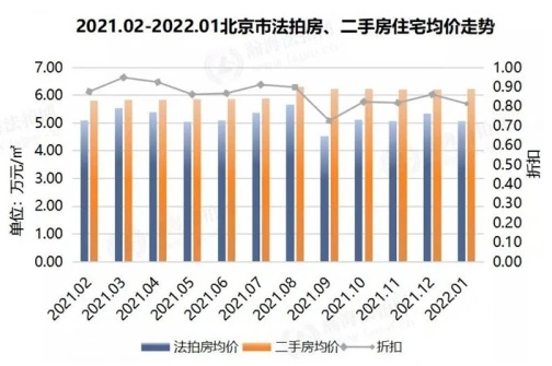 1月,北京市法拍房住宅成交均價5.06萬/㎡,環比2021年12月下調0.29萬/㎡,平均折扣為市場價的7.8折,連續6個月維持在8折以下低位運行,共計為購房者節省12.57億元的購房差價,入場空間巨大。