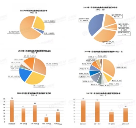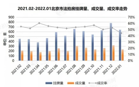 1月,北京法拍房市場掛牌房源644套,環比上月下降17.75%;成交房源233套,成交率為44%(按照扣除撤拍房源數量后計算得出)。總體來看,北京法拍房市場掛牌數量在近5個月,除了2021年12月掛牌激增外,2022年1月份掛牌量位居第二位。