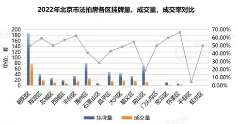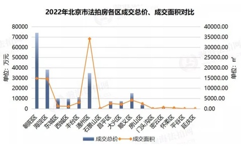 以上,是2022年1月北京法拍房市場的數據情況。北京法拍房市場在二手房解凍緩慢回暖后,表現出了觸底上升的信號,成交量233套,成交面積也出現回升。其中,朝陽區依舊強勢霸榜,成為北京法拍房市場的銷冠,成交量和成交金額均領先其他區域。通州區由于成交了玫瑰坊獨棟商業以及張各莊村國有土地使用權,成交面積趕超朝陽,排名榜首。