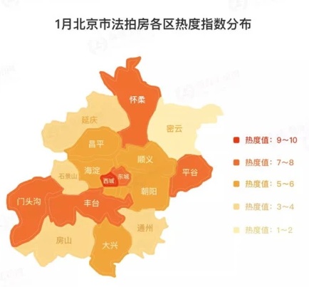 1月,北京法拍房市場熱度最高的是西城區,平均10人爭搶1套法拍房;懷柔區和豐臺區套均參拍人數分別為8.50人和8.47人分庭抗禮;密云區和石景山區熱度較低,套均參拍人數均未超過3人。