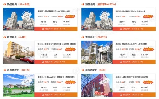 1月,熱度最高的為朝陽區翠成馨園,溢價率144.95%,共計31人參拍,最終267萬成交;差價最大的為順義區優山美地,差價2900萬;成交最低折扣4.4折,為密云區檀城東區,起拍價216萬成交;最高成交價是朝陽遠洋LAVIE,7311萬成交;房山區城北社區成交價最低,僅85萬成交。