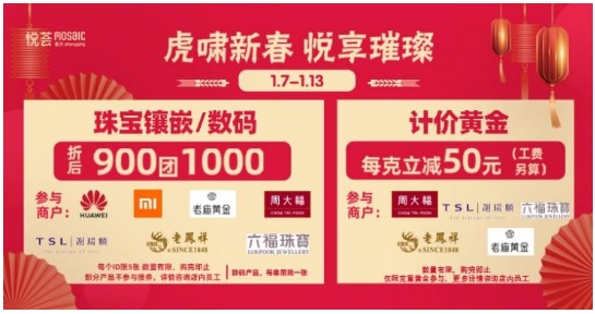 1月7日-1月13日重慶悅薈舉辦了以“虎嘯新春,悅享璀璨”為主題的迎春活動(dòng),折后900團(tuán)1000,計(jì)價(jià)黃金克減50元,謝瑞麟四葉草項(xiàng)鏈、老鳳祥精打細(xì)算算牌吊墜,小米12等大牌名品折扣帶給顧客非同尋常的福利沖擊體驗(yàn)。不僅于此,重慶悅薈1月14日-16日還舉行了抓錢機(jī)活動(dòng)和滿額送春聯(lián)活動(dòng),活動(dòng)驚喜瞬間拉滿,迎春的氛圍直接到達(dá)高潮。