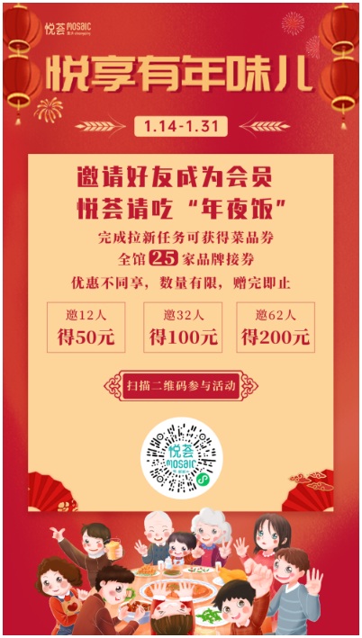 迎新春,過(guò)新年,少不了的團(tuán)圓飯,重慶悅薈還開(kāi)展了“請(qǐng)你吃年夜飯”線上邀人得餐飲品牌券活動(dòng),全館25家接券,最高得200元,豐富的團(tuán)年飯活動(dòng),提升消費(fèi)者的購(gòu)物激情,也為消費(fèi)者帶來(lái)更多的實(shí)惠。