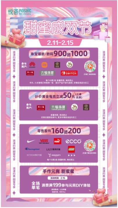 2月11日-2月15日,情人節元宵雙雙來臨,重慶悅薈購物中心開展的“甜蜜成雙節”“手作元宵甜蜜蜜”兩檔鉅惠活動,為消費者的節日送禮計劃開啟了神助攻;顒悠陂g全場珠寶數碼900團1000,黃金每克立減50元,零售服飾160團200。2月11日-2月14日,拍照打卡定位重慶悅薈,還可領取情人節主題氣球一個,為消費者帶來了滿載的快樂。