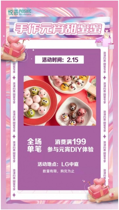 隨著情人節與元宵節的浪漫邂逅,二月浪漫的氛圍愈發濃郁,熱力值不斷上升,為此位于重慶大石壩的“重慶悅薈購物中心”開展了許多針對不同節點的促銷活動,讓顧客們感受到了多樣化的消費體驗,同時體現了重慶悅薈購物中心品質、愉悅、幸福感及服務社區的宗旨。
