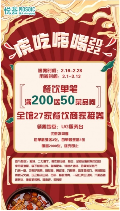 2月16日-2月28日,虎年開工在即,鉅惠活動再度加碼,重慶悅薈以“虎吃嗨喝”為主題的餐飲優惠活動驚喜來襲,單筆滿200送50菜品券,全館27家餐飲商家可供選擇,以“元氣回血,開工大吉”為目的的消費者紛沓而來,“開工加餐,蓄力戰斗值”已成為消費者不可或缺的聚餐話題,以“虎吃嗨喝”為主題的餐飲優惠活動繼情人元宵節后又引起了一場熱潮。