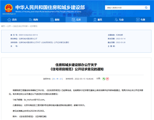 3月15日,住房和城鄉建設部辦公廳發布關于《住宅項目規范》公開征求意見的通知。通知顯示,根據住建部工程建設標準編制工作計劃,《住宅項目規范》已起草完成,在前期多次征求意見基礎上修改完善并經專家審查通過。