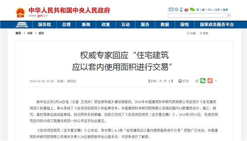 2019年的2月24日,新華社發布《權威專家回應“住宅建筑應以套內使用面積進行交易”》的文章,文中援引中國建筑科學研究院有限公司相關負責人的解釋稱:“住宅建筑應以套內使用面積進行交易”這一條款的提出,在規范起草過程中,對國際國內住宅面積計算做法進行調研,按套內使用面積計算是國際通行做法,而我國住宅面積計算方式主要采用建筑面積或套內建筑面積。