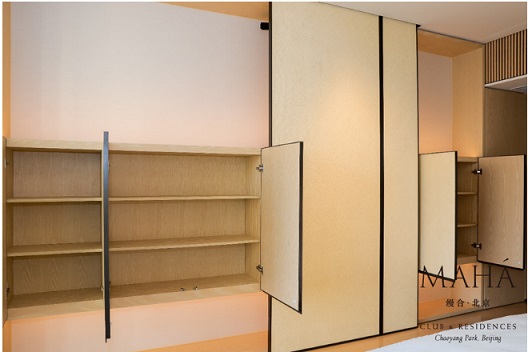 縵合室內各個廳和房間,都包含有大量的隱形收納空間,表面是美觀的木飾面鑲嵌著珍寶閣,打開柜門,卻又有大量的收納空間,使空間兼具美觀與實用性。