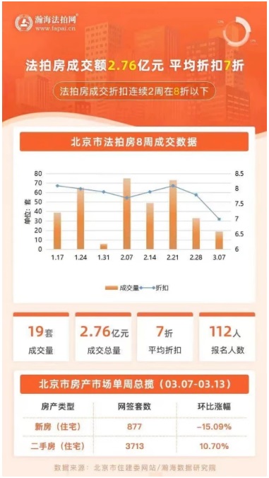 北京法拍房方面,上周成交法拍房19套,成交率41.3%。成交折扣低至7折,成交折扣連續2周在8折以下,為購房者提供了低價上車的機會。在上周成交的北京法拍房中,海淀區冠城北園,成交差價達865萬;房山剛需房產宏塔社區,成交價僅109萬,首付僅38出頭,北京法拍房為剛需提供了難得的上車機會。