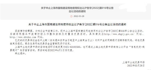 3月28日,上海土地交易市場發布通知稱,因疫情防控需要,現中止上海市2022年首輪集中供地出讓活動,后續將根據疫情防控工作整體安排及時重啟交易活動。