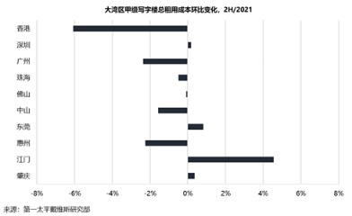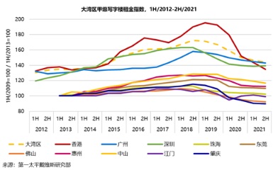 2021年下半年,盡管大灣區(qū)經(jīng)濟(jì)持續(xù)復(fù)蘇,但受奧密克戎席卷全球、市場(chǎng)供過(guò)于求持續(xù)、部分大型開(kāi)發(fā)商面臨一定資金壓力的共同影響,大灣區(qū)甲級(jí)寫字樓租金和價(jià)格指數(shù)分別環(huán)比下降1.9%和1.6%。