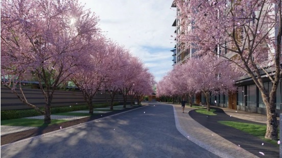 為了與日式禪意奢宅這個(gè)定位相呼應(yīng),項(xiàng)目還在小區(qū)門口重金打造了一條櫻花大道