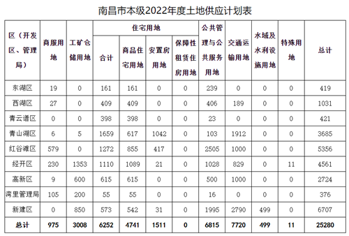 4月12日,南昌市自然規劃局公布2022年度土地供應計劃表,市本級供地計劃總規模為25280畝,其中工礦倉儲用地3008畝,商服用地975畝,商品住宅用地4741畝,安置房用地1511畝,公共管理與公共服務用地6815畝,交通運輸用地7720畝,水域及水利設施用地499畝,特殊用地11畝。
