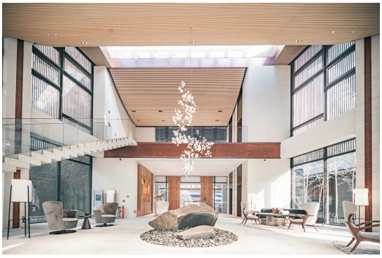這里的精髓可以用一個詞來概括:四谷三庭。寓意一方天地間,感受四季變幻的絕美風景,塑造三重歸家禮序。由西至東,四條綠廊與一條水軸貫穿樓宇之間,分別命名為「春之谷」、「夏之谷」、「秋之谷」和「冬之谷」,搭配種植了各個季節的時令植株。