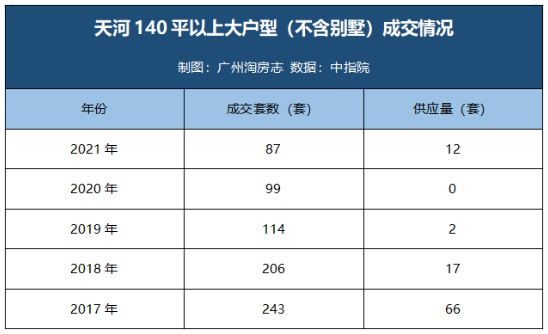 以2021年為例,140㎡以上大戶型,僅有區區12套供應,但成交卻達到87套,供求比低至0.13,意味著每放出一套房源,就約有10個人想買入!不難判斷,買少見少的天河大戶型產品,留給普通人的機會,還會進一步壓縮。