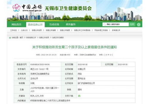據悉,此次《通知》的實施對象為生育二個孩子及以上的無錫戶籍居民家庭。