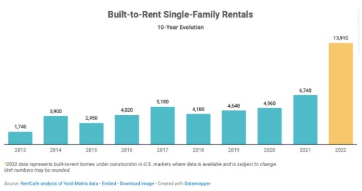 更重要的是,建造更多這種按需租賃類型的競爭正在加速。根據Yardi Matrix的數據,2021 年,有6,740 套新長租別墅竣工——這是迄今為止的最高年度竣工總量。但是,這只是一個趨勢的開始,預計今年建設速度將翻一番,大約有14,000套建造出租房屋正在建設中。