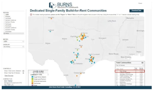 據美國權威房地產咨詢機構John Burns 4月定制型長租別墅社區市場份額排名,Wan Bridge以市場份額13.8%奪得德州榜首!在全美市場占比2.3%,排名第四。
